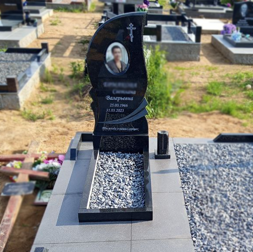 Вертикальный одиночный памятник из черного гранита на подставке с открытым цветником оригинальной и элегантной формы. Наиболее важной частью здесь является фигура с плавными и скругленными линиями, внешне напоминающая каплю воды. Снизу она обрамлена небольшими рельефными вставками, что придает ей особую изящность и красоту.